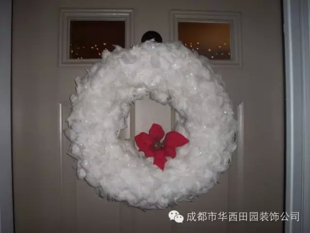 这是圣诞节一种专门用在门上的挂饰。有各式各样的。这个是羽毛制成的。