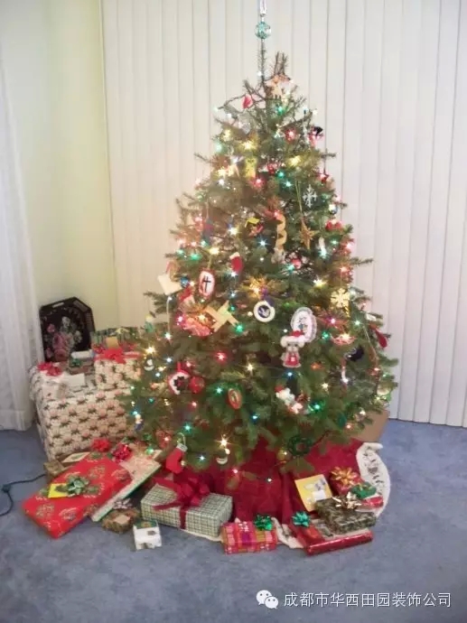 现在很多人家都用人造的塑料圣诞树。不过这颗圣诞树是真的松树。上面挂满圣诞树挂,树下堆满圣诞礼物。