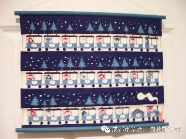 门上布制的艺术挂历。共有24个图。每个图实际上是一个小袋子。代表从12月1日到24日。显示人们盼望圣诞,数着日子到12月25日。