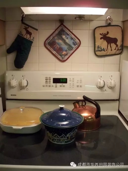 烧饭地方的圣诞挂饰。餐具也有圣诞图案
