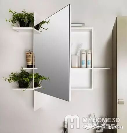 镜柜的选择也是一门学问,传统的镜柜早已让人见怪不怪,而这种边缘带有小隔板的镜柜则可以承载更多的收纳任务。