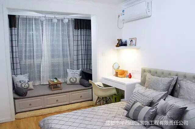 卧房的飘窗打造出一个功能完备的办公区,同时满足衣物、杂物收纳以及梳妆等多种功能。