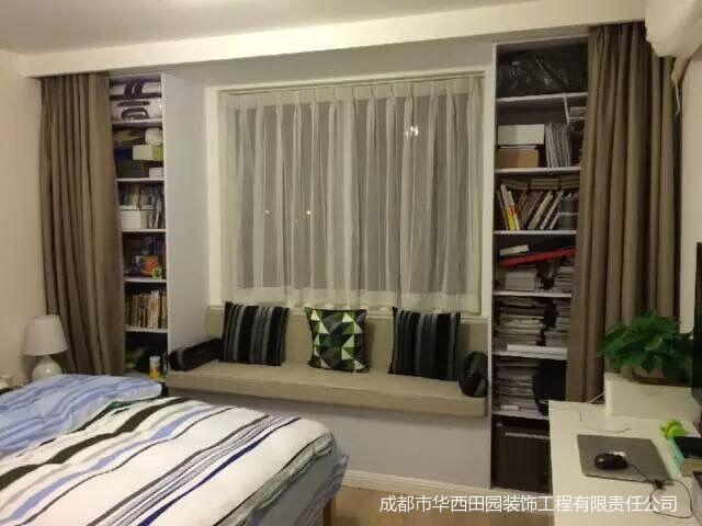 飘窗较大,可以定制结构更加丰富的书柜,将左右两边的空间充分利用起来。