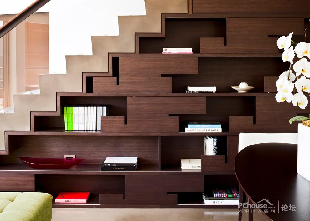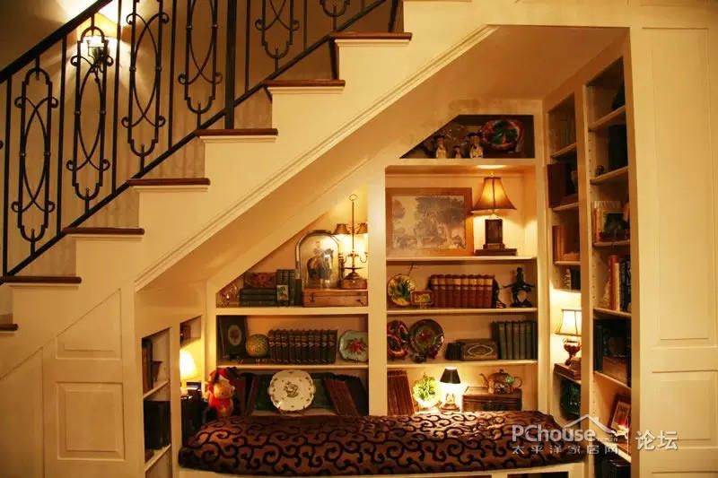 1、楼梯下做一个书柜,搭配一个软垫,就可以坐在这里看书了。