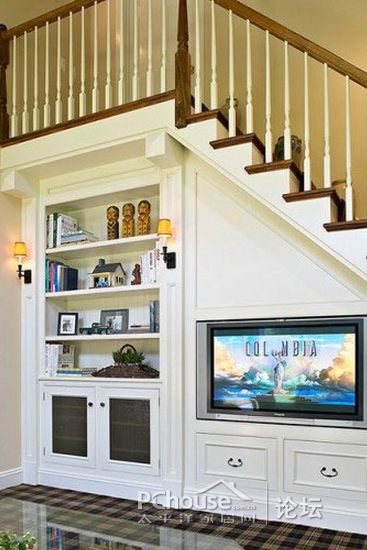 8、小户型客厅,将楼梯间做成一个电视柜组合也不错