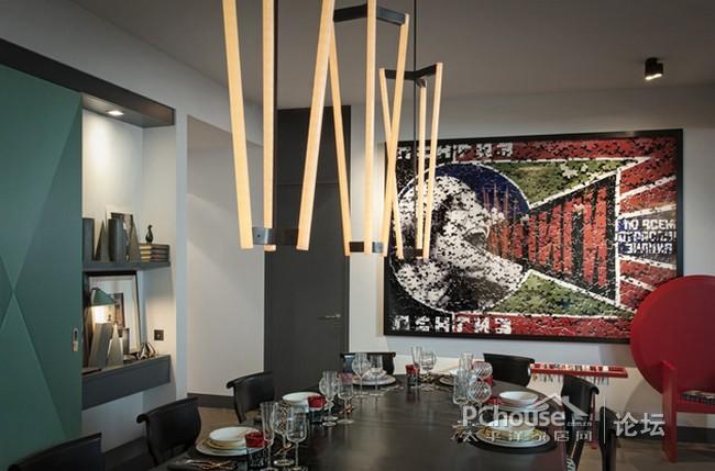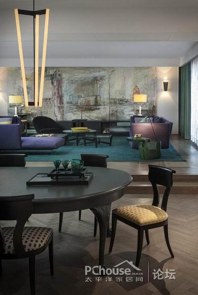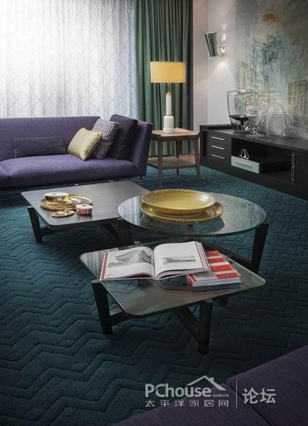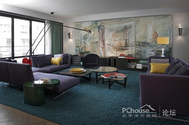 撞色美学以20世纪20年代的发起的美学运动为设计灵感,以突出的色彩拼接让人耳目一新, 蓝绿色的地毯,紫色的沙发,鲜艳的红色配饰,冲突碰撞产生了强烈的视觉效果,带有灵魂的设计,强调舒适感,突出艺术性。